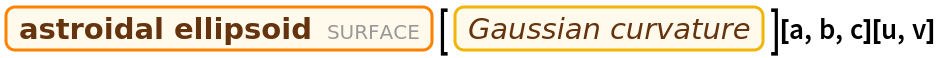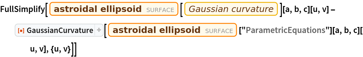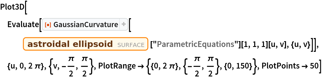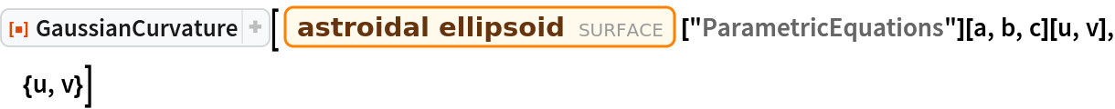 ResourceFunction["GaussianCurvature"][s,{u,v}] computes the Gaussian curvature of the surface s parameterized by u and v. | |