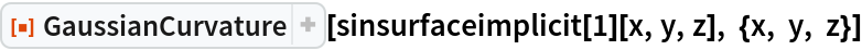 ResourceFunction["GaussianCurvature"][eq,{x,y,z}] computes the Gaussian curvature of the surface s given by the implicit equation eq in variables x,y and z. |