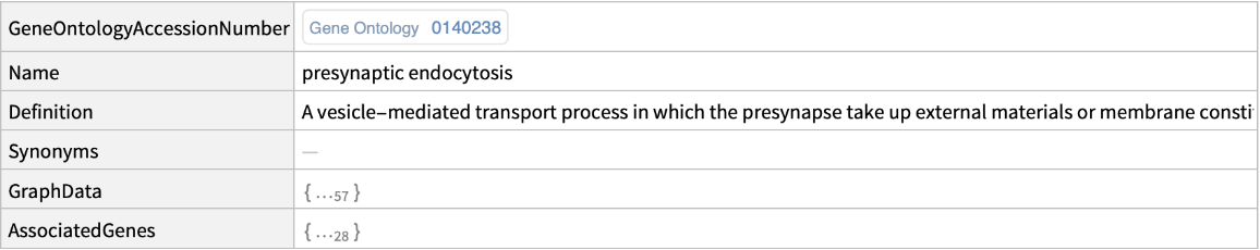 Information about a Gene Ontology concept is provided in a form of Dataset containing the following keys: