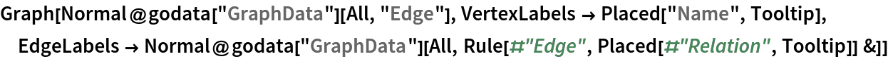 Graph[Normal@godata["GraphData"][All, "Edge"], VertexLabels -> Placed["Name", Tooltip], EdgeLabels -> Normal@godata["GraphData"][All, Rule[#"Edge", Placed[#"Relation", Tooltip]] &]]