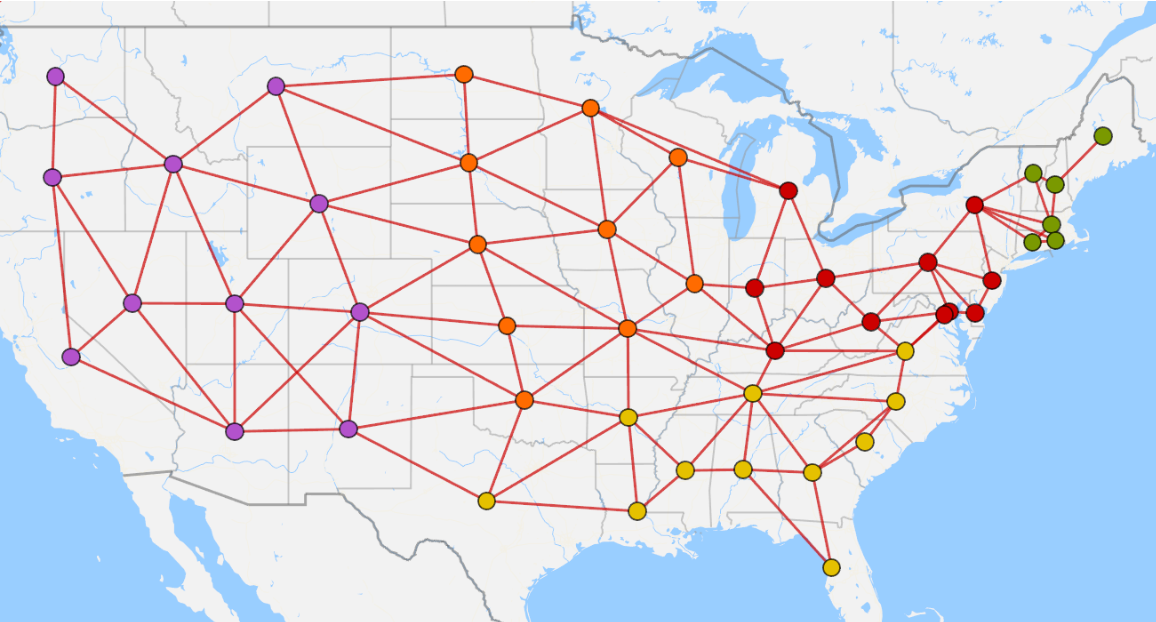 Visualize a graph of the 49 administrative divisions of the continental states including the District of Columbia: