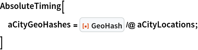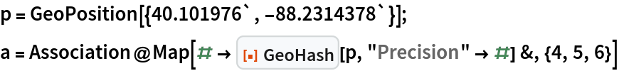 ResourceFunction["GeoHash"][lat,lon] finds the geohash for the geo location with coordinates lat and lon. | |