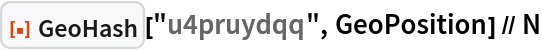ResourceFunction["GeoHash"][geoHash] decodes the given geoHash into a geo position. | |