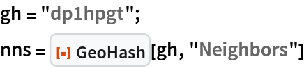 If the first argument is a valid geohash string and the second argument is "Neighbors" then a list of neighboring geohashes is returned: