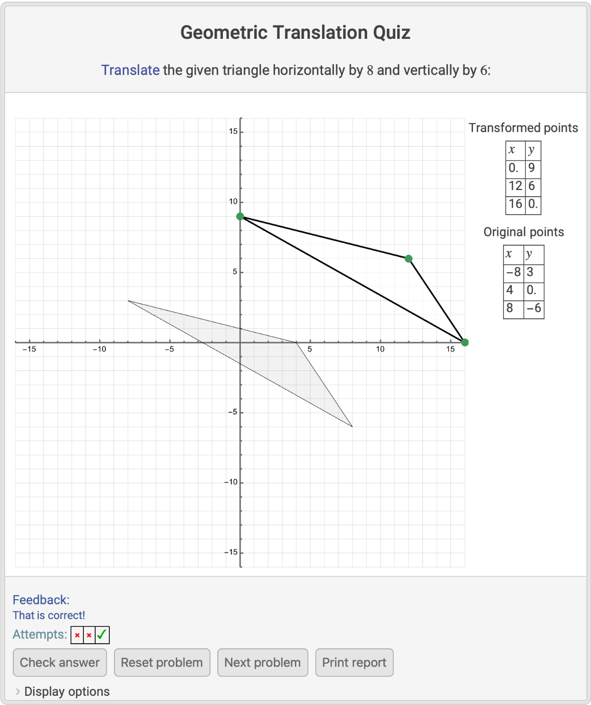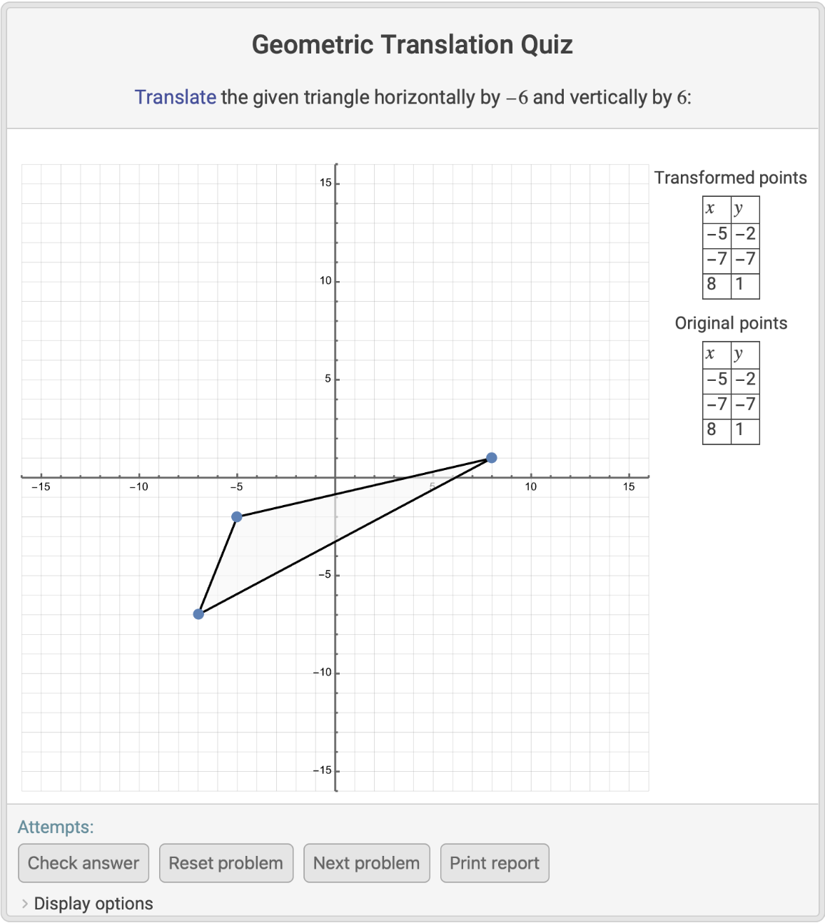 ResourceFunction["GeometricTranslationQuiz"][] creates an interactive assessment on plotting geometric transformations. |