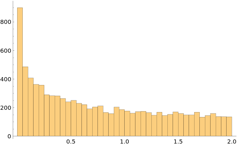 Check the distribution of the area of harmonic quadrilaterals in the unit circle: