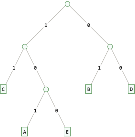 For instance the binary code word for "A" is 101 from above and it is retrieved in this way from the Huffman tree: