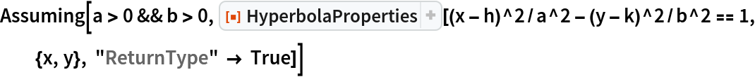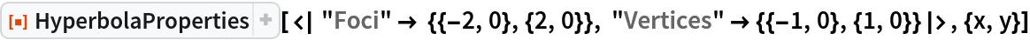 Hyperbola properties include "Equation", "Foci", "Vertices", "Eccentricity", "Asymptotes", "Center", "SemimajorAxisLength", "SemiminorAxisLength", "Directrices", "AxesOfSymmetry", "SemiLatusRectum", "RotationAngle", "ConjugateHyperbola" and "BaseConic".