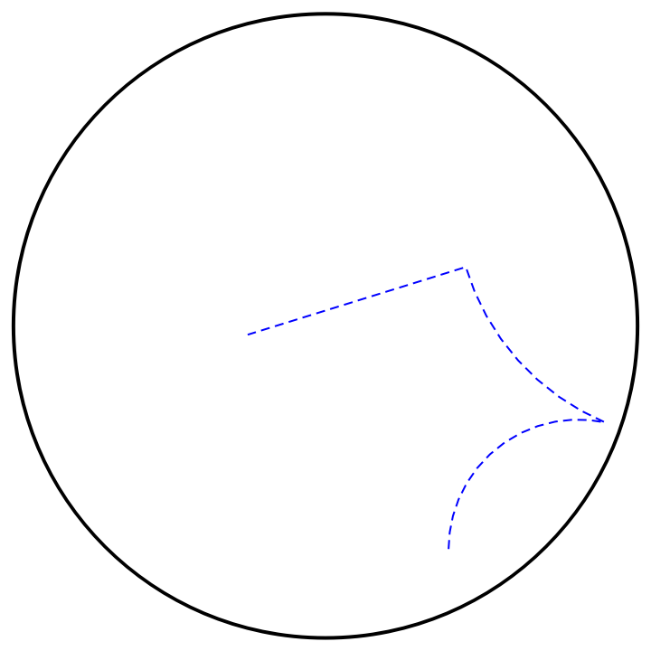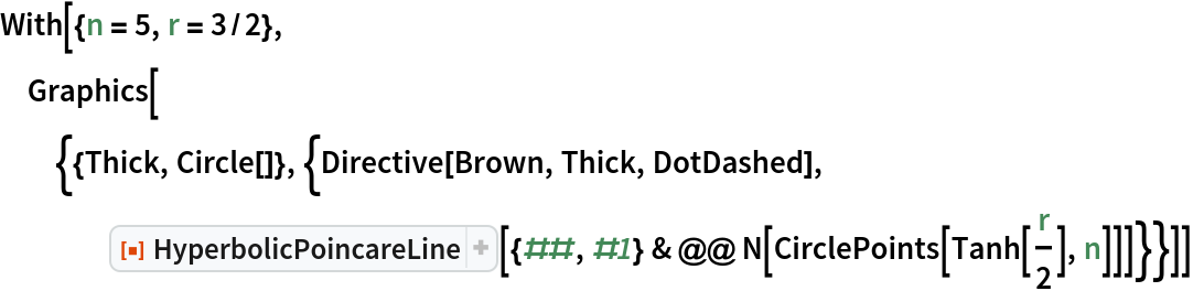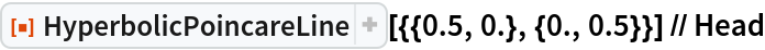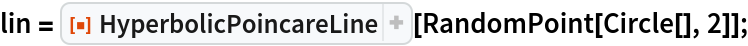 ResourceFunction["HyperbolicPoincareLine"][{p1,…,pn}] represents the hyperbolic line segments joining a sequence of points pi, embedded in the Poincaré disk. |