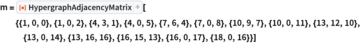 "HypergraphAdjacencyMatrix"][{{1, 0, 0}, {1, 0, 2}, {4, 3, 1}, {4, 0, 5}, {7, 6, 4}, {7, 0, 8}, {10, 9, 7}, {10, 0, 11}, {13, 12, 10}, {13, 0, 14}, {13, 16, 16}, {16, 15, 13}, {16, 0, 17}, {18, 0,