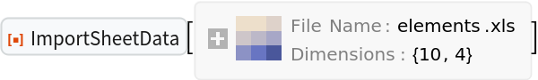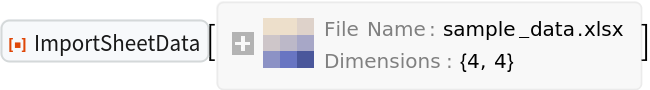 ResourceFunction["ImportSheetData"]["filepath"] imports the spreadsheet from the specified file. | |