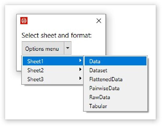 Open a system dialog box to select the spreadsheet file from which the data will be imported, then choose the sheet by name and format: