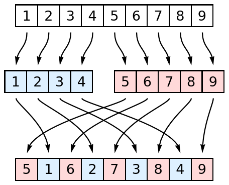 An in shuffle is defined as follows: (1) split the list in two halves; and (2) interweave each half of the list starting with the second half, such that every other card came from the same half of the original list.