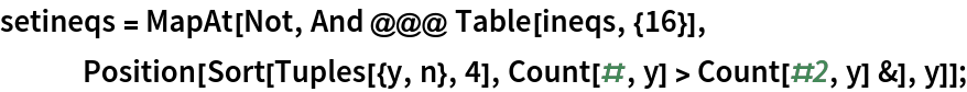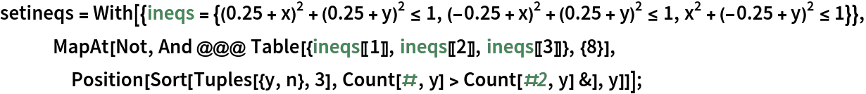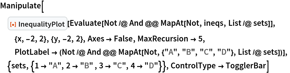 ResourceFunction["InequalityPlot"][ineqs,{x,y}] plots a set of inequalities with two independent variables. | |