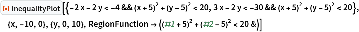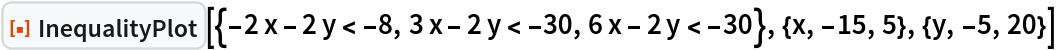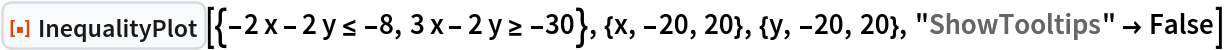 ResourceFunction["InequalityPlot"][ineqs,{x,x0,xf},{y,y0,yf}] plots a set of inequalities with two variables from x0 to xf and from y0 to yf. | |
