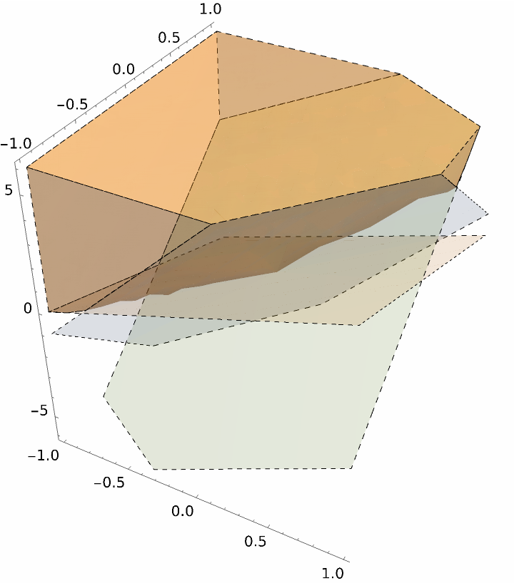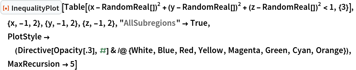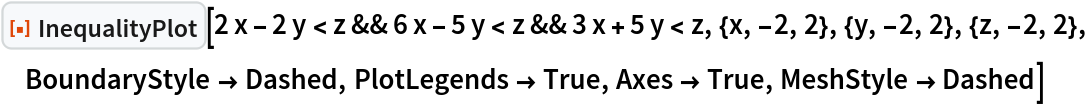 ResourceFunction["InequalityPlot"][ineqs,{x,y,z}] plots a set of inequalities with three independent variables. | |