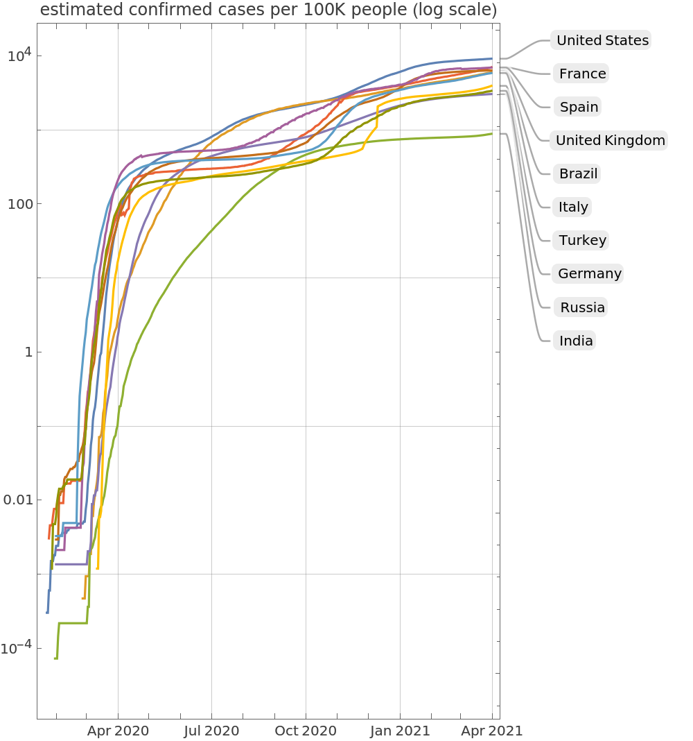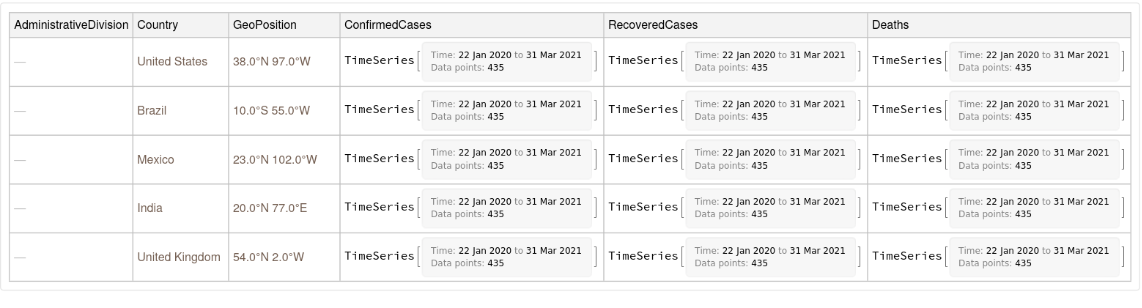 ResourceFunction["JHUCOVID19Data"]["WorldCountries"] returns COVID-19 confirmed cases and deaths by countries. |