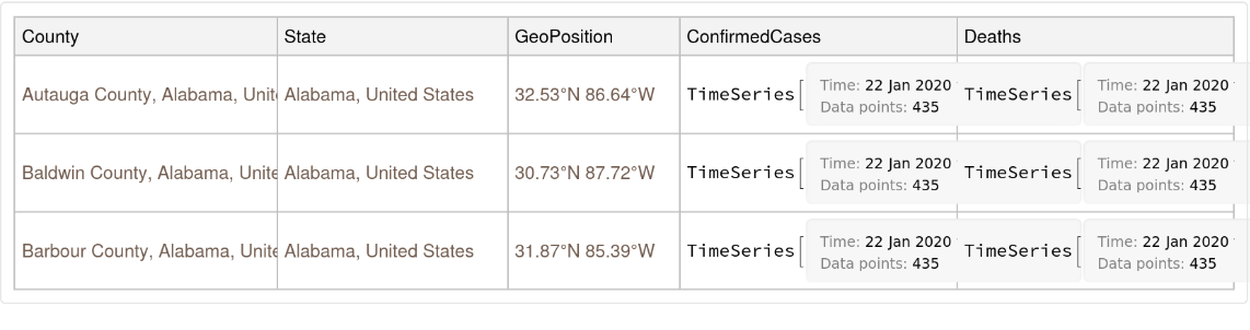 ResourceFunction["JHUCOVID19Data"]["USCounties"] returns COVID-19 confirmed cases and deaths by US counties. | |