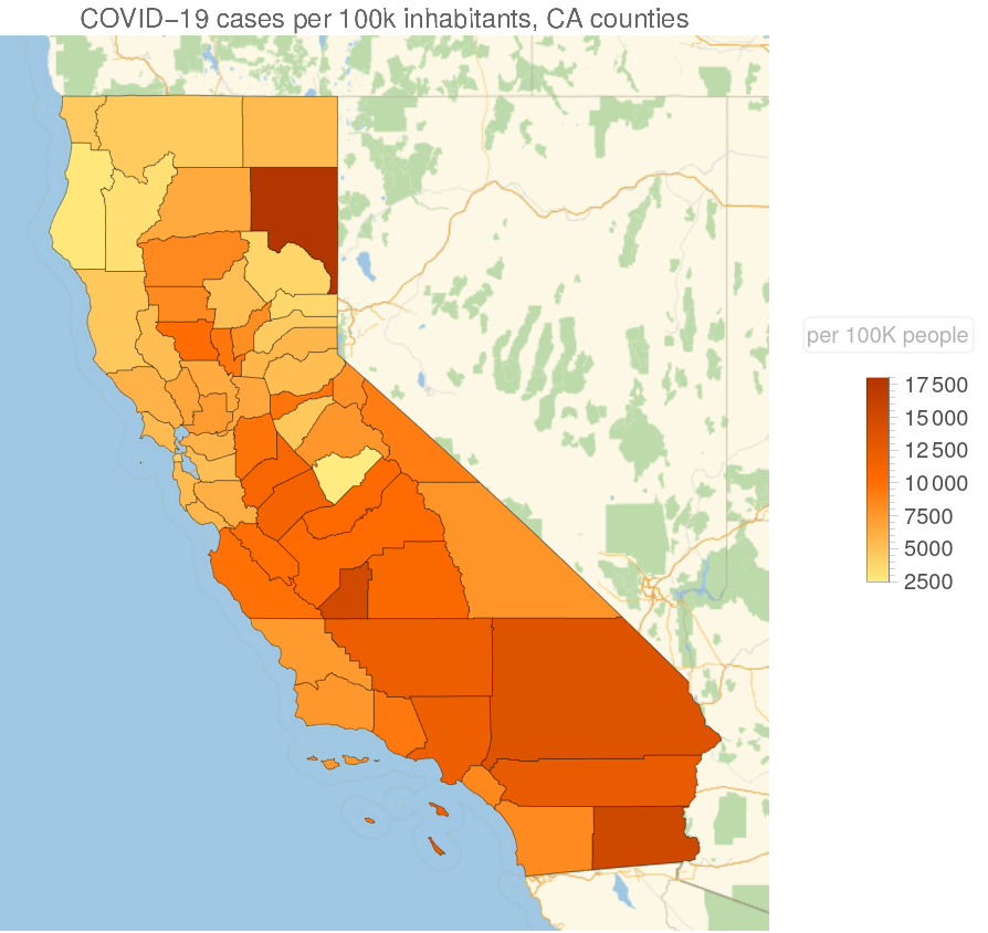 Visualize the confirmed cases of California counties, per 100k inhabitants: