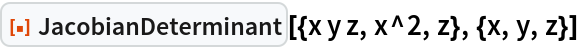 Compare this to the result obtained by taking the determinant of ResourceFunction["JacobianMatrix"] of the same expression: