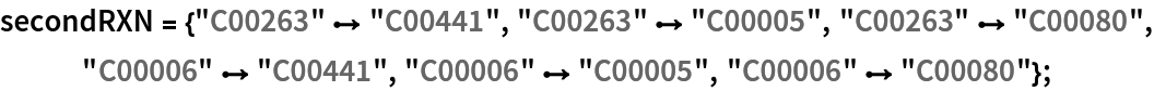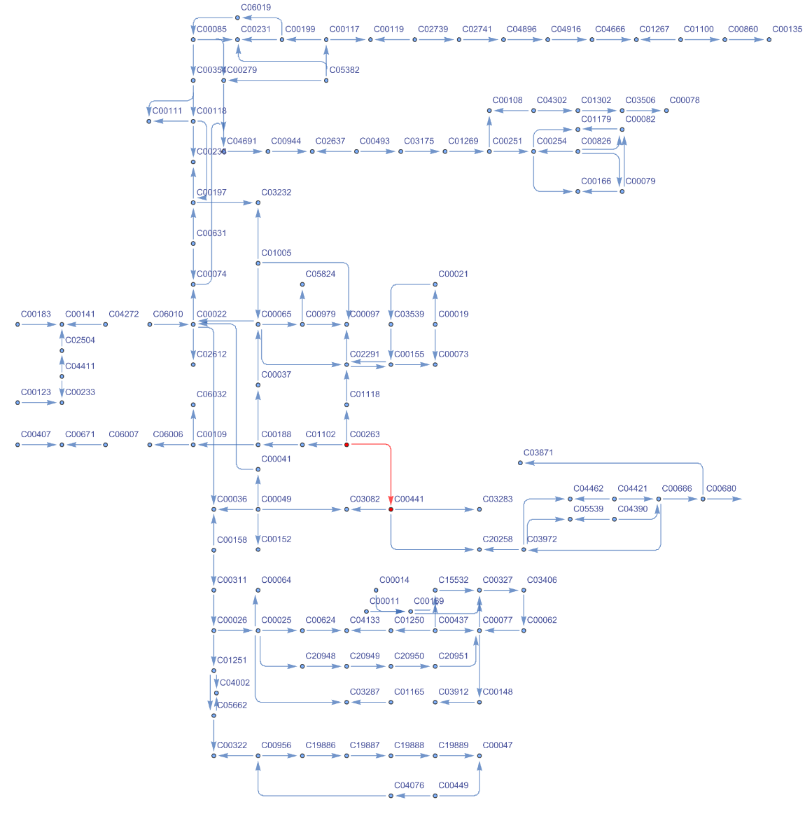 Highlighting in red (i.e., vertices and edges) the reaction catalyzed by the K00003 orthology: