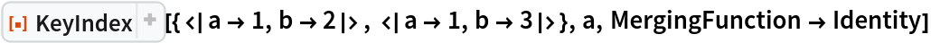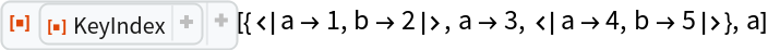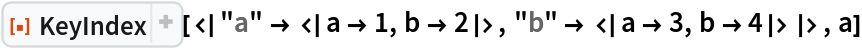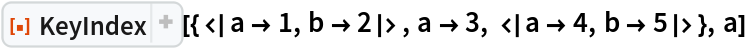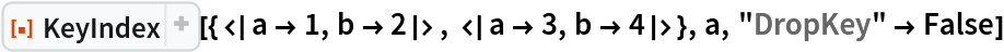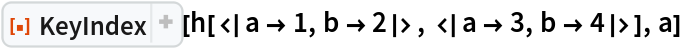 ResourceFunction["KeyIndex"][{a1,a2,…},key] gives an Association that has keys ai[key] and values ai with key dropped. | |