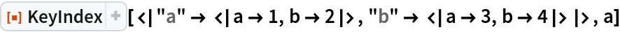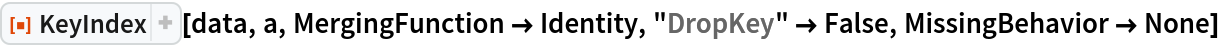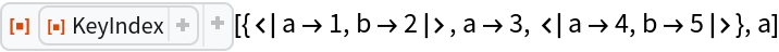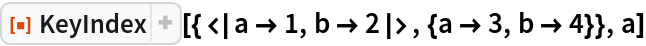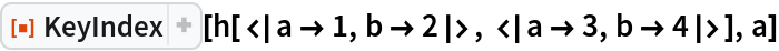 ResourceFunction["KeyIndex"][{a1,a2,…},key] gives an Association that has keys ai[key] and values ai with key dropped. | |