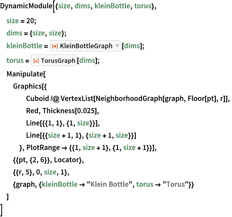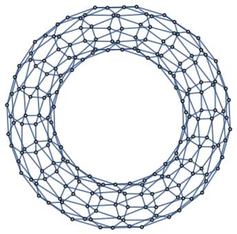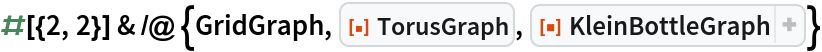 ResourceFunction["KleinBottleGraph"][{a,b}] gives an a×b grid connected as a Graph that corresponds to the 1-skeleton of the Klein bottle. | |