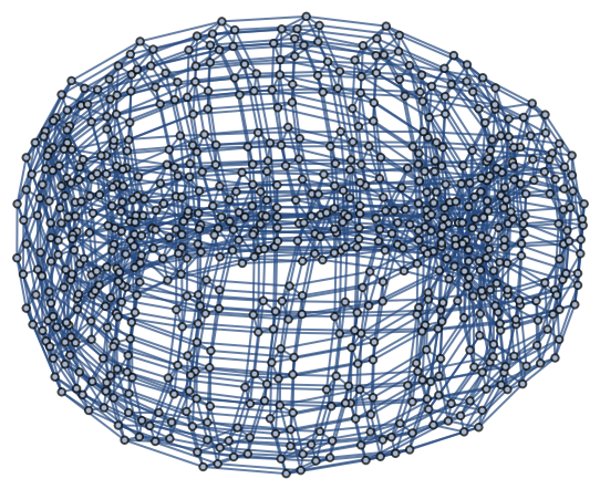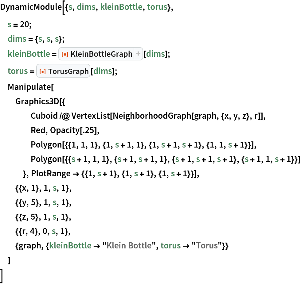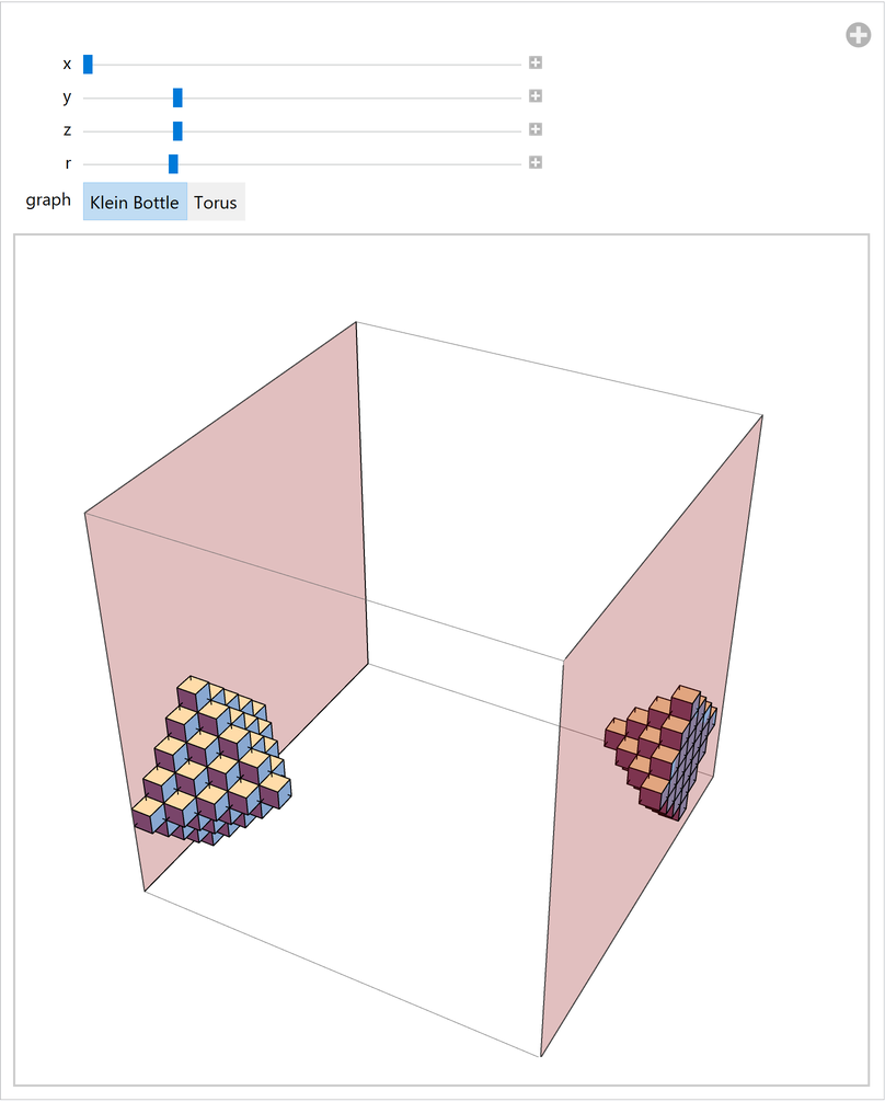 ResourceFunction["KleinBottleGraph"][{a,b,n1,…,nk}] gives a graph corresponding to the product of the Klein bottle and a k-torus. |