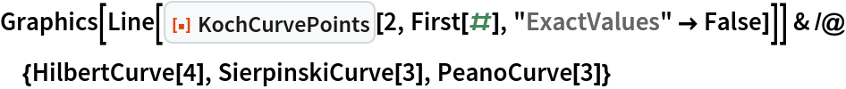 Line[ResourceFunction["KochCurvePoints"][2, First[#], "ExactValues" -> False]]] & /@ {HilbertCurve[4], SierpinskiCurve[3], PeanoCurve[3]}