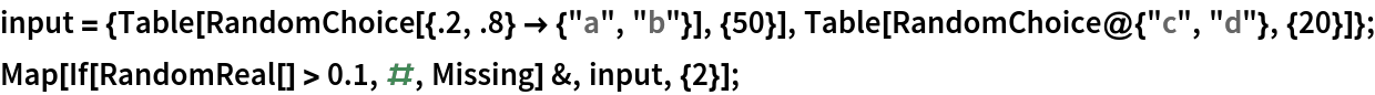 input = {Table[RandomChoice[{.2, .8} -> {"a", "b"}], {50}], Table[RandomChoice@{"c", "d"}, {20}]};