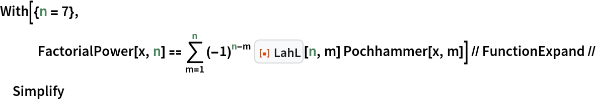 ResourceFunction["LahL"][n,m] gives the Lah number L(n,m). |