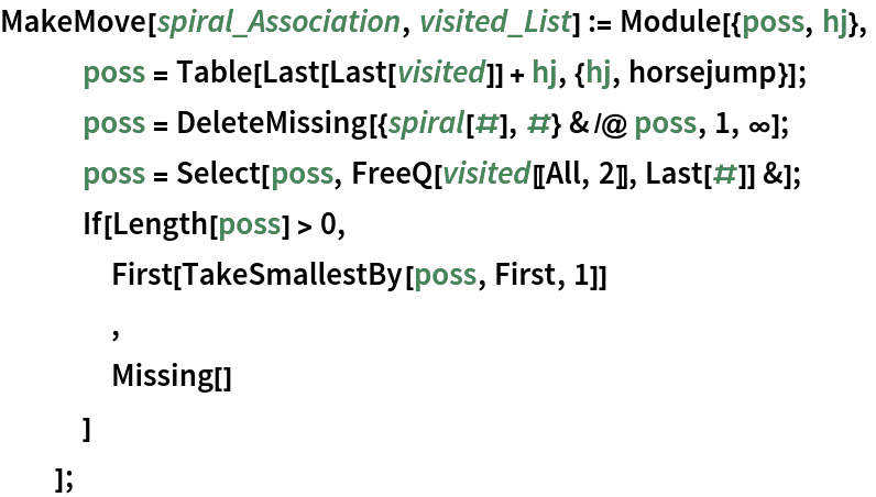 Recreate the OEIS A316667 sequence of a horse moving on a spirally numbered board and moving to the lowest available unvisited square at each step: