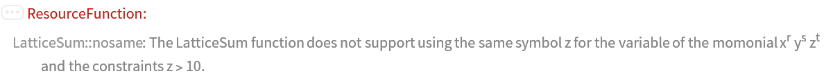 ResourceFunction["LatticeSum"][monomial,constraints] gives the sum of monomial over all integer lattice points satisfying the constraints. |