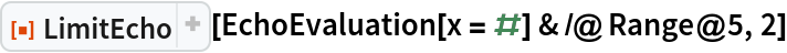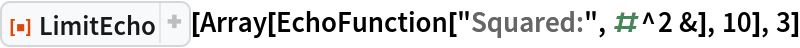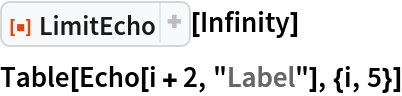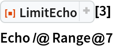 ResourceFunction["LimitEcho"][expr,n] limit the number of Echo outputs printed during evaluation of expr to n. | |