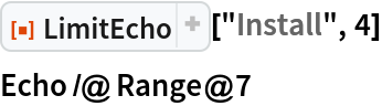 ResourceFunction["LimitEcho"]["Install",n] limit the number of Echo outputs in this and all future sessions. | |