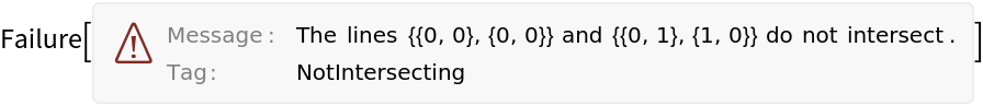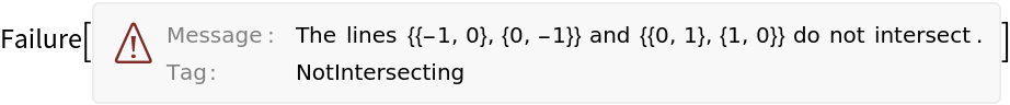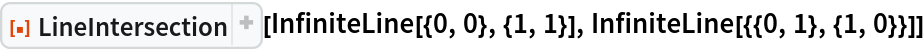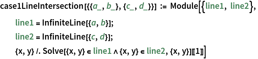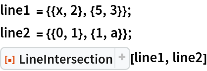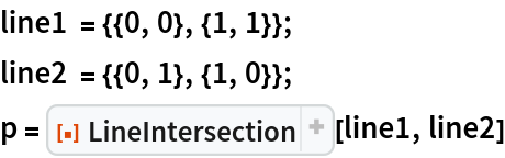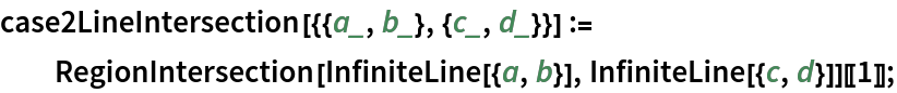 ResourceFunction["LineIntersection"][{{a,b},{c,d}}] returns the intersection of the infinite lines through points a to b and points c to d. |