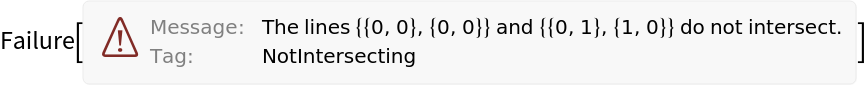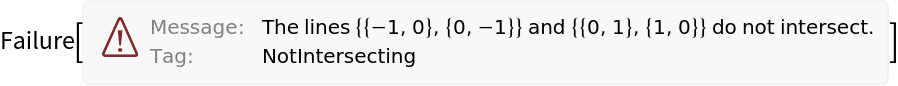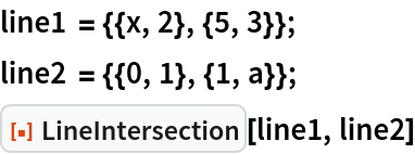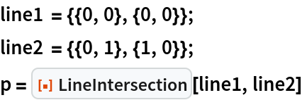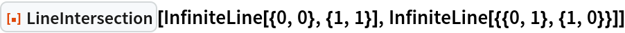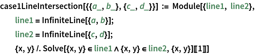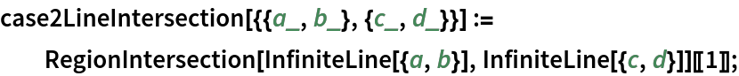ResourceFunction["LineIntersection"][{{a,b},{c,d}}] returns the intersection of the infinite lines through points a to b and points c to d. |