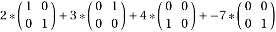 ResourceFunction["LinearCombination"][{u}, {vi}, type] returns the given representation type that express u as a linear combination of the vi. |