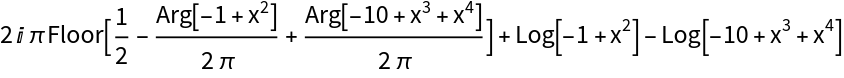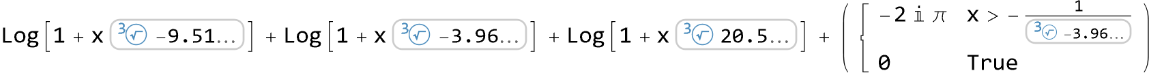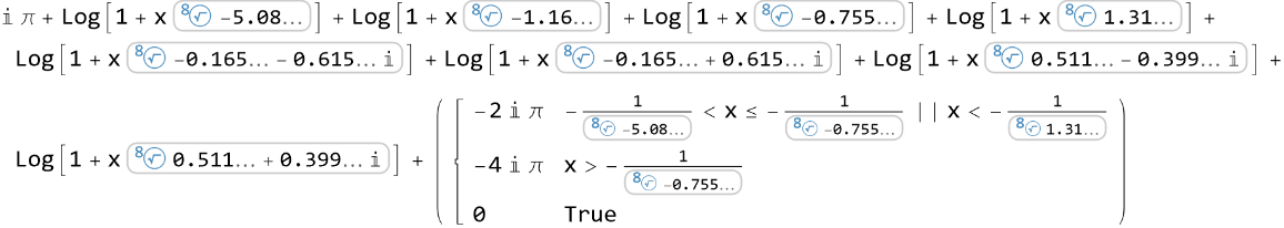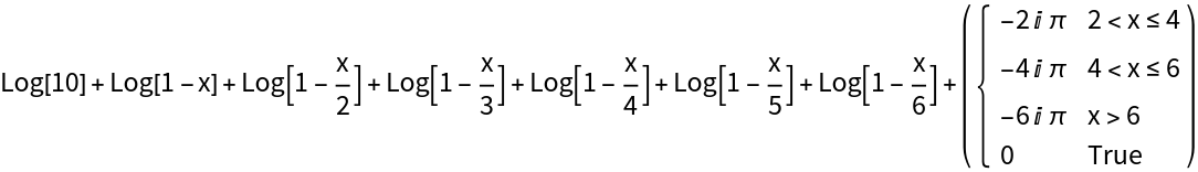 On the principal branch, when x>2 the factor 1-x/2 is negative real, each Log contributes πⅈ. LogAffineExpand automatically inserts a compensating piecewise constant term -2πⅈ so the result is exactly equal to the original input on the principal branch. A similar branch correction for a simple rational function: