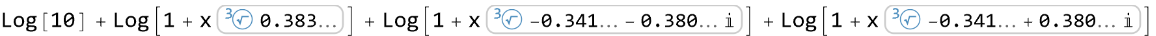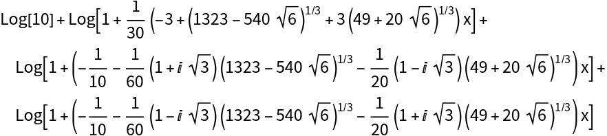 For a random 3 x 3 integer matrix, LogAffineExpand rewrites Log[Det[I-xA]] as a constant plus one affine log per eigenvalue, adding a piecewise 2πⅈ term for principal-branch correctness on the real line. Nice for spectral checks and trace expansions: