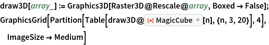 ResourceFunction["MagicCube"][n] generates a magic cube of rank n. |