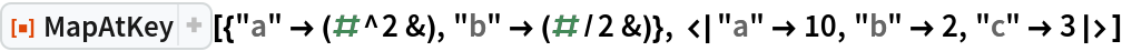 ResourceFunction["MapAtKey"][{key1→f1,…},assoc] gives an association with each fi applied to the value of keyi in assoc. |