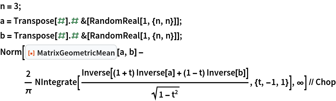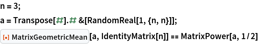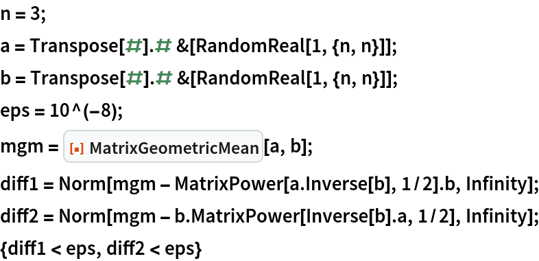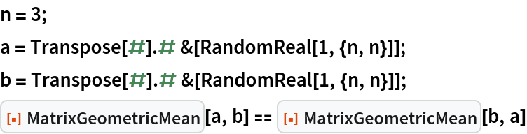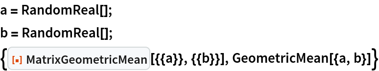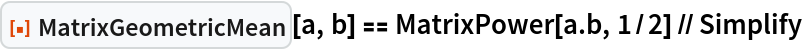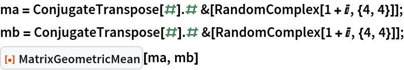 ResourceFunction["MatrixGeometricMean"][a,b] gives the geometric mean of the matrices a and b. |