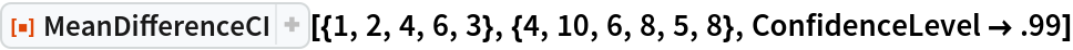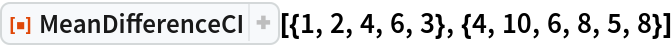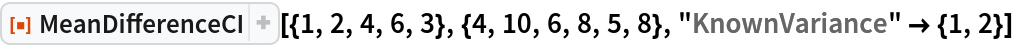 ResourceFunction["MeanDifferenceCI"][list1,list2] gives a confidence interval for the difference between the population means estimated from list1 and list2. |