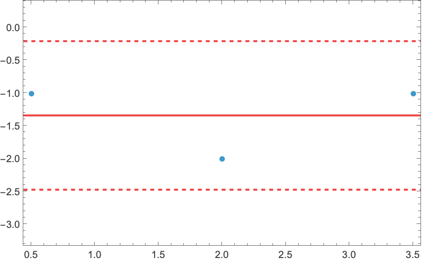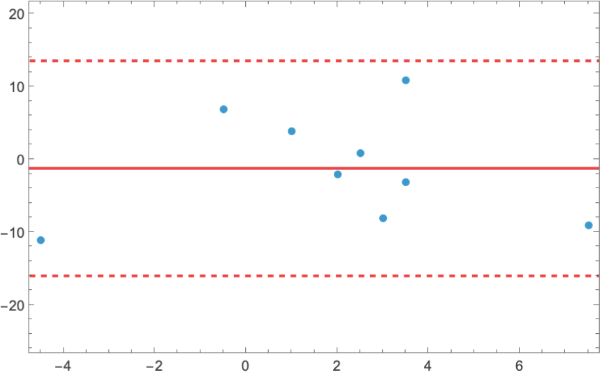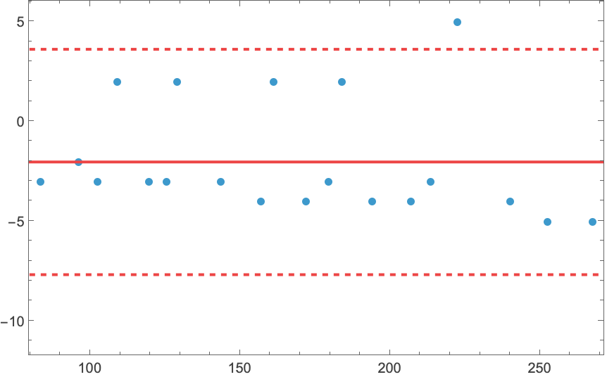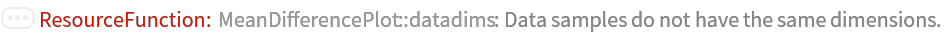 ResourceFunction["MeanDifferencePlot"][d1, d2] plots the pairwise means against the differences of d1 and d2. |