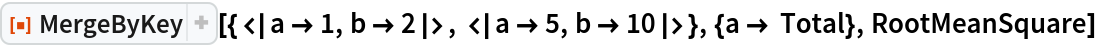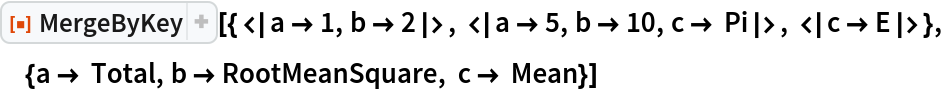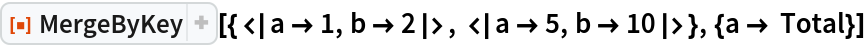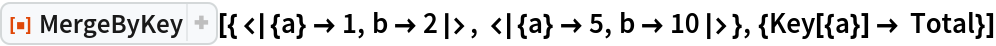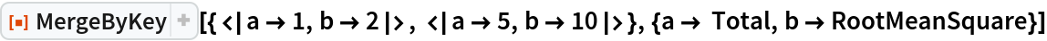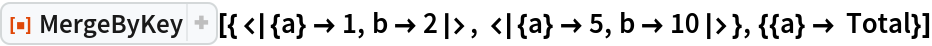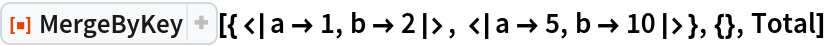 ResourceFunction["MergeByKey"][{assoc1,assoc2,…},{key1→f1,key2→f2,…}] merges the associations associ, using the the functions fi for combining the values of keys keyi. | |
