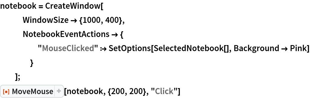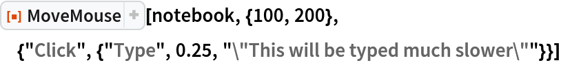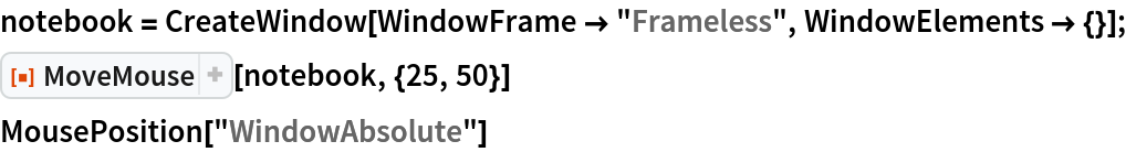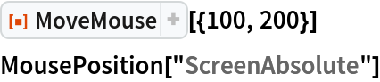 ResourceFunction["MoveMouse"][notebook,{x,y}] moves the mouse cursor to the coordinates (x,y) using the position of notebook as the offset. | |