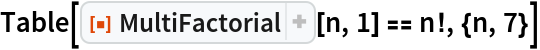 MultiFactorial[n,1] is equivalent to Factorial[n] (n!):