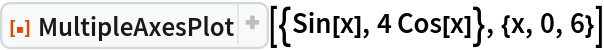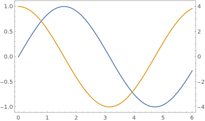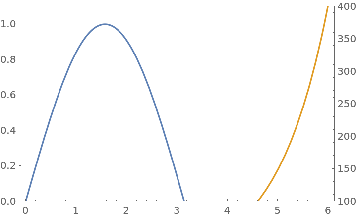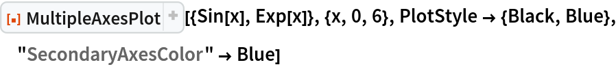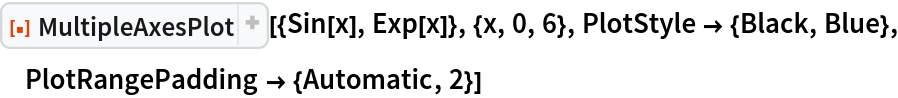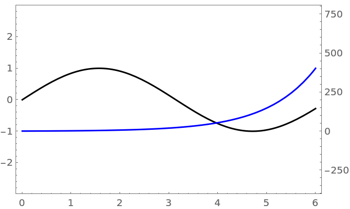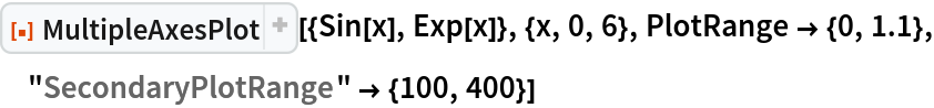ResourceFunction["MultipleAxesPlot"][{expr1,expr2},{x,xmin,xmax}] generates a plot of expr1 and expr2 with two y-axes. |